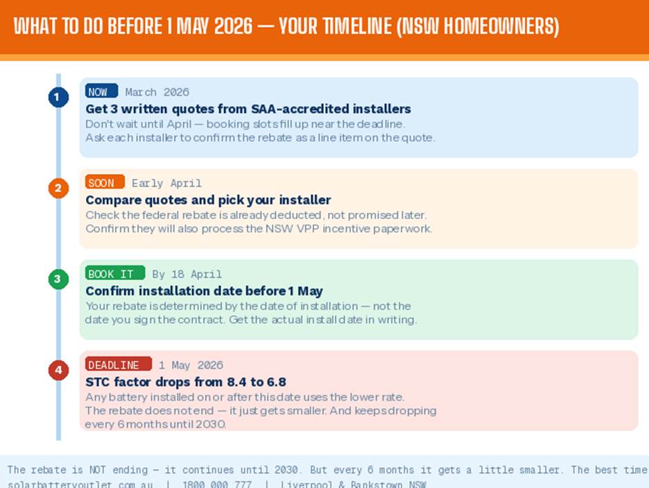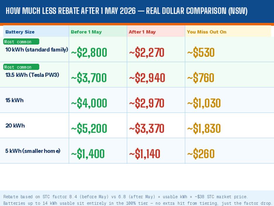 But something IS changing on 1 May 2026, and it is worth understanding properly — because depending on the size of battery you are considering, it could mean anywhere from $260 to well over $1,800 less in your pocket if you install after that date.