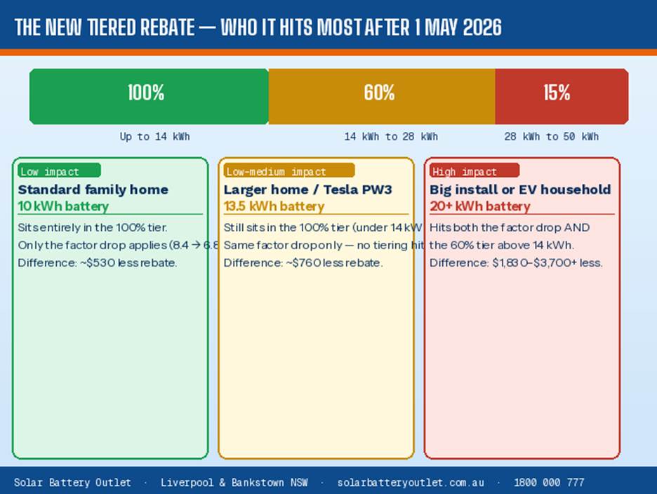 From 1 May 2026, there is also a new tiered rebate structure for larger batteries. This is separate from the factor drop and only affects systems above 14 kWh.