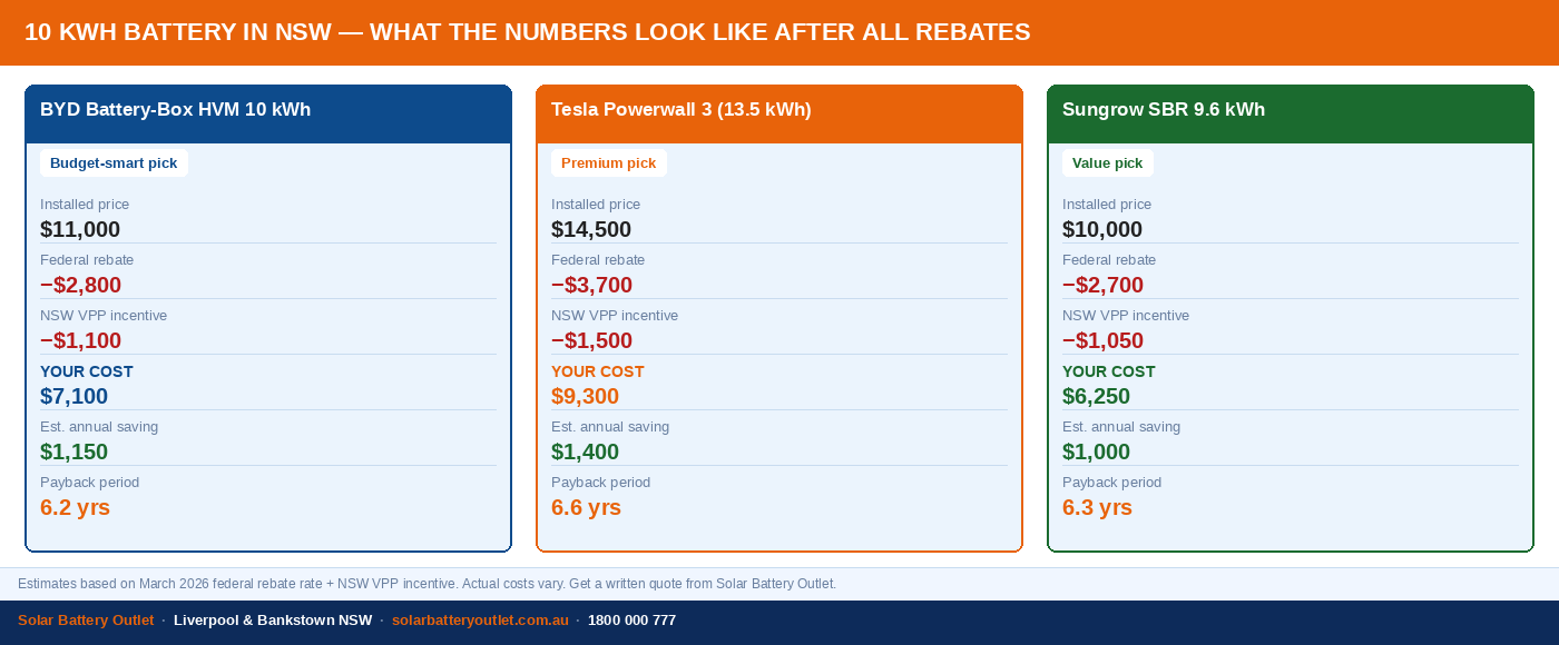 - All prices shown are after the federal Cheaper Home Batteries Program rebate (before 1 May 2026 rate of $311/kWh usable). NSW VPP incentive is additional.
